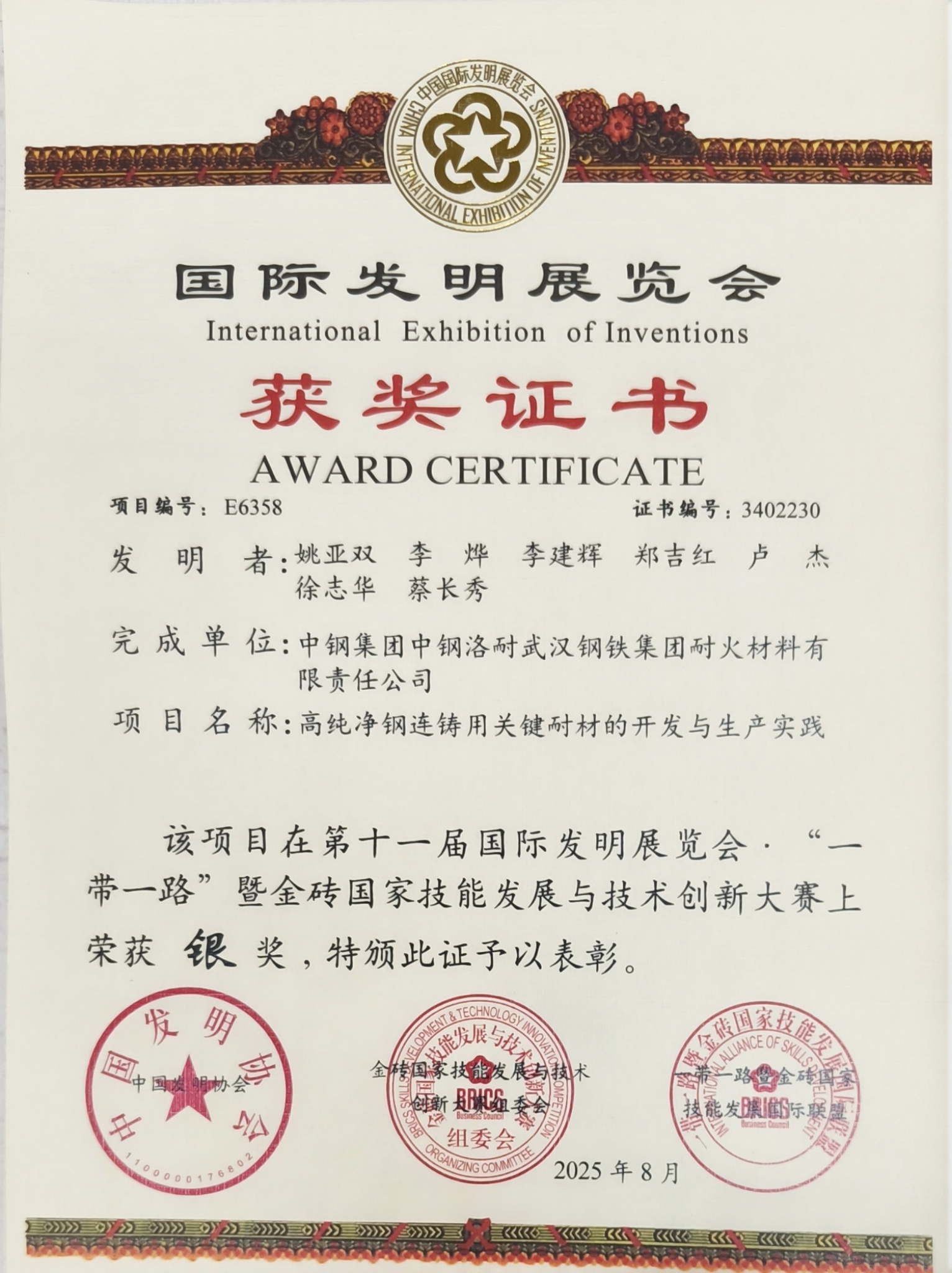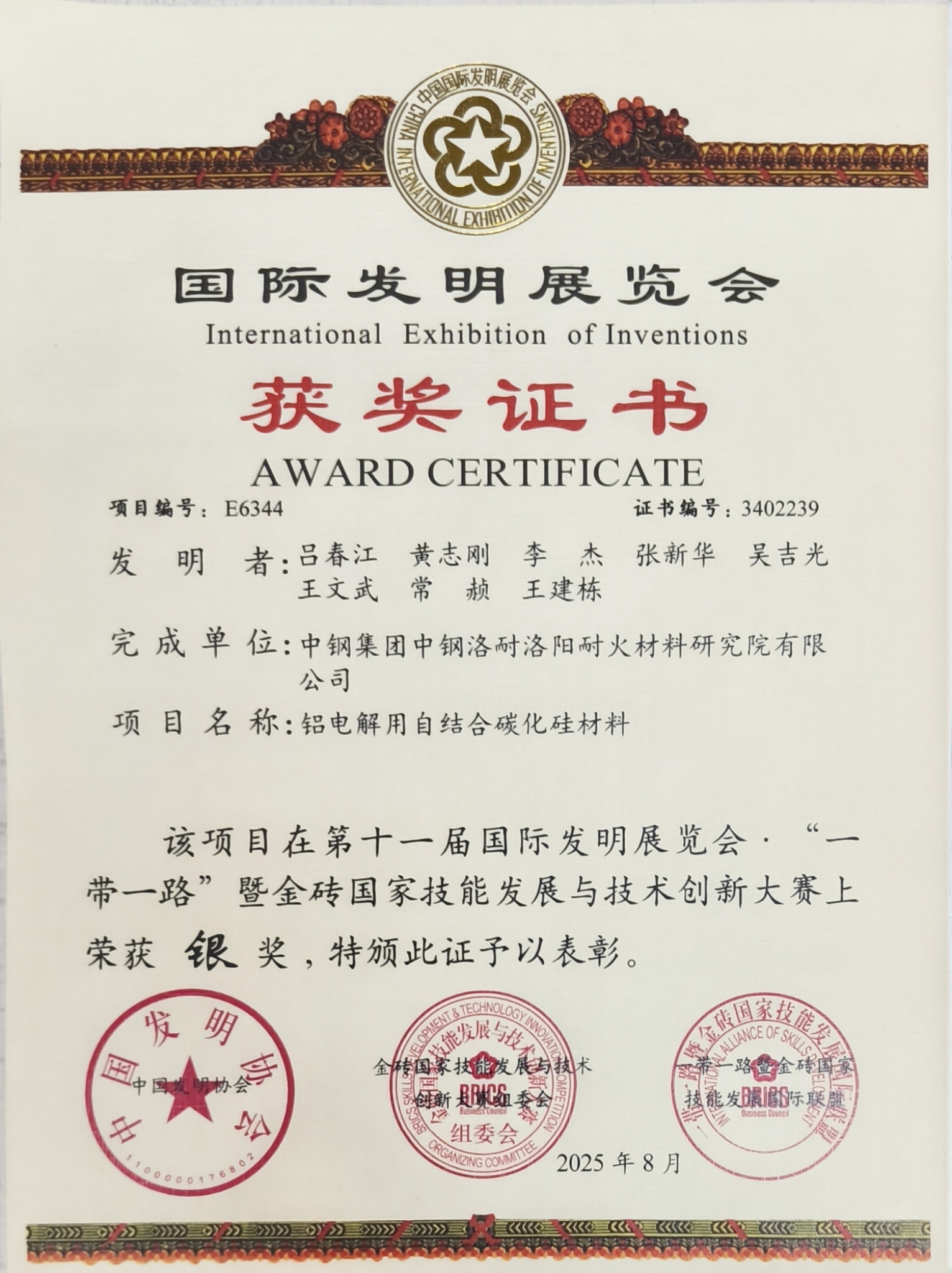 近日,第十一届国际发明展览会暨 “一带一路” 暨金砖国家技能发展与技术创新大赛在广州圆满落幕。中钢洛耐凭借“铝电解用自结合碳化硅材料”与“高纯净钢连铸用关键耐材的开发与生产实践”两项成果,从众多参赛项目中脱颖而出,双双摘得银奖,彰显了中国耐材行业在绿色制造与技术创新领域的国际竞争力。
