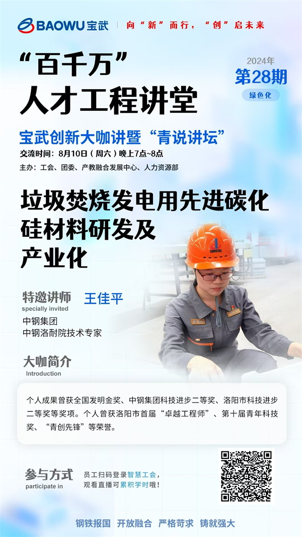 近日,中钢洛耐院技术专家王佳平受邀参加中国宝武“百千万”人才工程讲堂,作了题为《垃圾焚烧发电用先进碳化硅材料研发及产业化》的精彩直播课程分享。