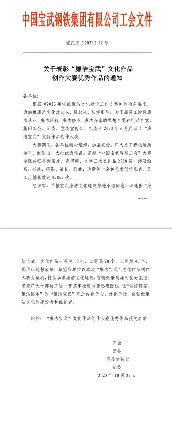 近日,“廉洁宝武”文化作品创作大赛优秀作品获奖名单揭晓,中钢洛耐多项作品荣获奖项。