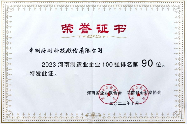 中钢洛耐入列2023河南制造业企业100强