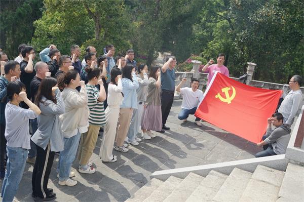沿青石板拾级而上,在“革命烈士永垂不朽”的纪念碑前,大家驻足鞠躬、致敬先烈。“我志愿加入中国共产党……”面对鲜红的党旗,大家高举右拳,重温了入党誓词。