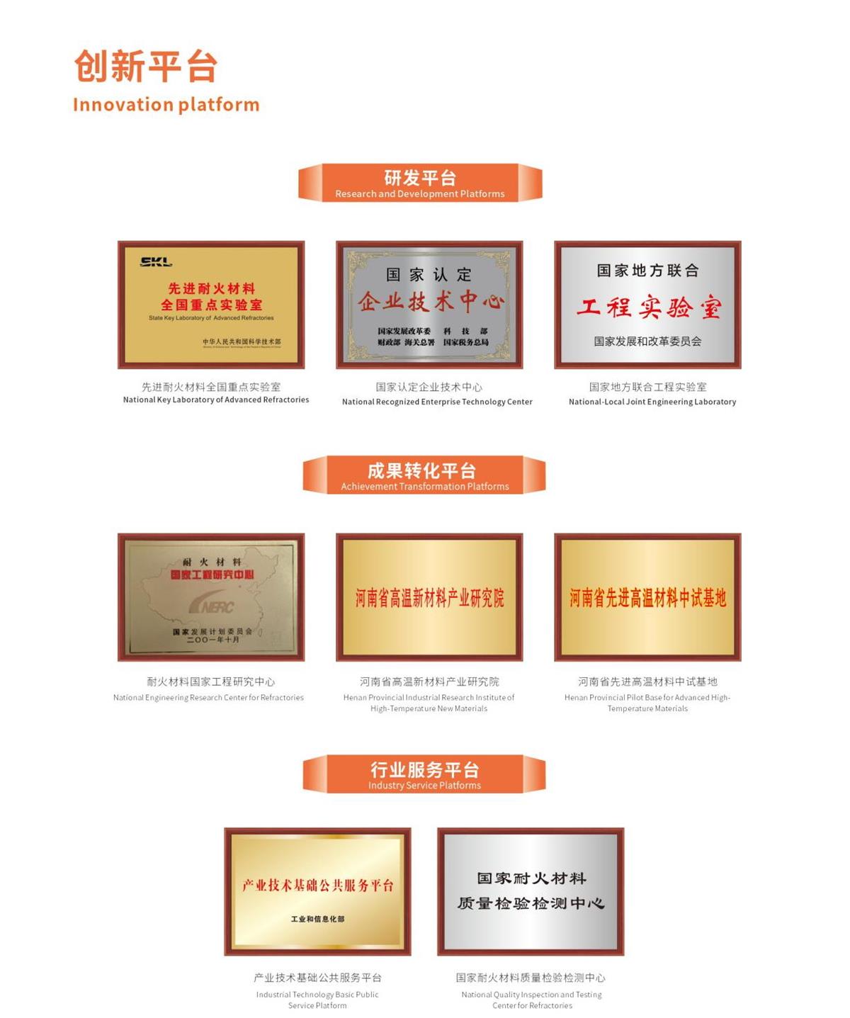公司持续构建“研发中心+产线研发”双轨创新体系,形成了“研发+中试产业化+行业服务+人才培育”多级创新平台架构。公司拥有先进耐火材料全国重点实验室、国家级企业技术中心、国家地方联建工程实验室、国家工程研究中心、国家耐火材料质量检验检测中心、产业技术基础公共服务平台(部省共建)、省级工程研究中心、省级工程技术研究中心、省级产业研究院、省级中试基地;设有院士工作站、中原学者科学家工作室和博士后科研工作站等20余个省部级以上创新平台。