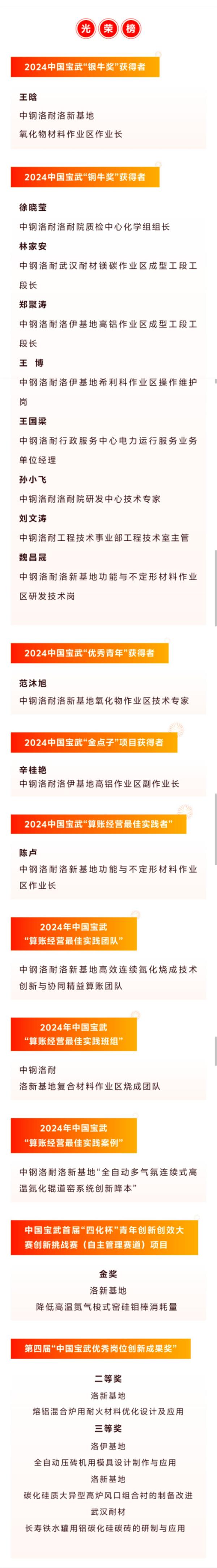 2024年,公司上下各条战线广大职工以“科技创新、变革调整、降本增效、市场拓展”为主线,面对钢铁行业长周期减量下行的严峻市场形势和公司生产经营所面临的任务和挑战,立足本职岗位,守正创新、勇毅笃行,在迎战寒冬中体现了新担当、展现了新作为,涌现出一批扎根洛耐、无私奉献的先进集体和个人。