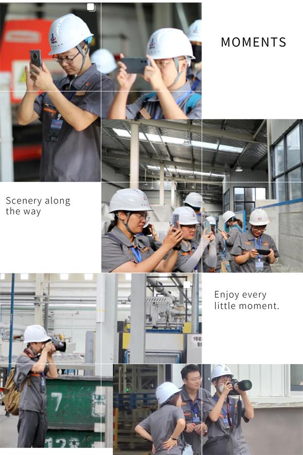 来到生产一线、科研现场,各位采风人员的热情立刻被点燃,立体式的仓储系统、智能化的生产设备、包装整齐的发运现场、专注的科研场景……采风人员纷纷拿出手机、相机,不断调整参数设置、拍摄角度,或侧身弯腰,或目光专注,不断寻找着最佳光线,抓拍、录制着一个个精彩瞬间。大家一边创作一边互相交流拍摄心得,用镜头记录着中钢洛耐干部职工勤劳奋斗的身影,定格一线员工安全规范操作、爱岗爱企的美好瞬间。