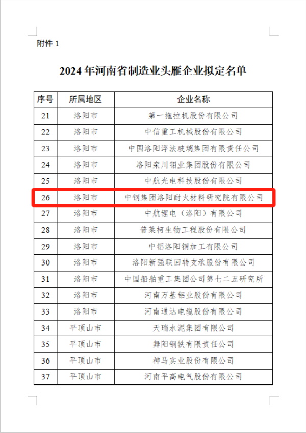 中钢洛耐院成功入选2024年河南省制造业头雁企业名单