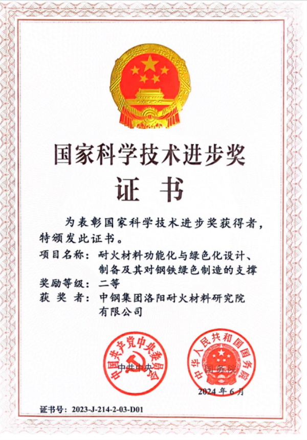 6月24日上午,全国科技大会、国家科学技术奖励大会、两院院士大会在北京人民大会堂隆重召开。由中钢集团洛阳耐火材料研究院有限公司牵头,中钢洛耐科技股份有限公司(以下简称“中钢洛耐”)、宝山钢铁股份有限公司、北京科技大学、河南熔金高温材料股份有限公司、武汉钢铁有限公司、南京钢铁股份有限公司等单位联合申报的“耐火材料功能化与绿色化设计、制备及其对钢铁绿色制造的支撑”项目荣获国家科学技术进步二等奖。