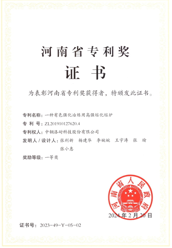 近日,河南省政府发布 “关于表彰第四届河南省专利奖”的通知,中钢洛耐发明专利“一种有色强化冶炼用高强熔化熔炉”喜获一等奖。这是中钢洛耐首次荣获河南省专利奖,实现了省专利奖的重大突破。