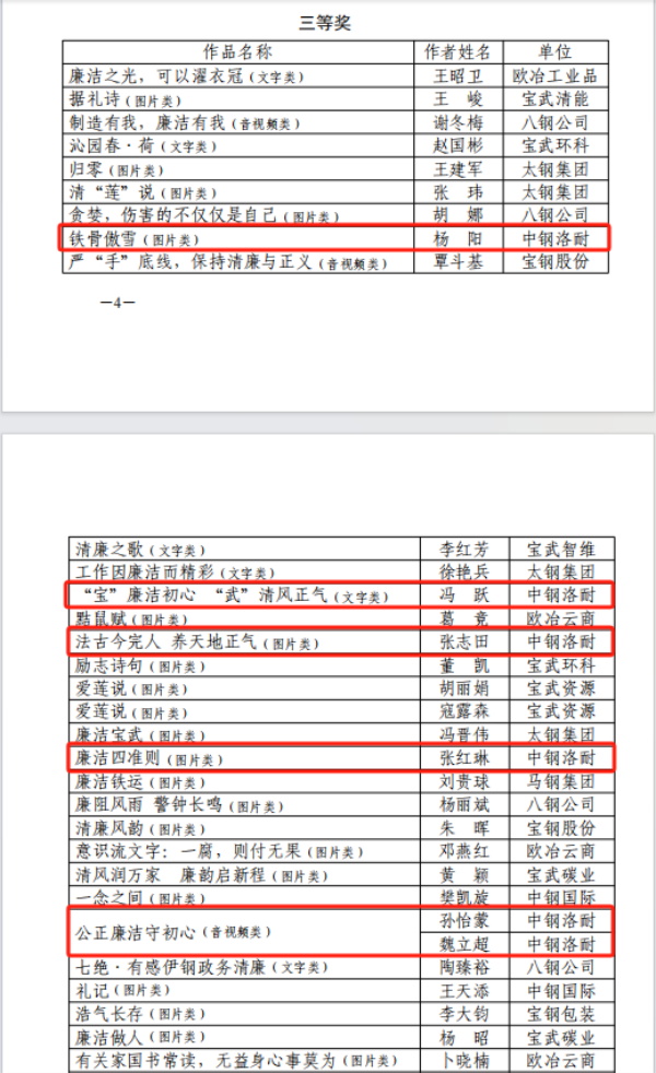 经评审,中钢洛耐图片类作品《铁骨傲雪》(作者:杨阳)、《法古今完人 养天地正气》(作者:张志田)、《廉洁四准则》(作者:张红琳),文字类作品《 “宝”廉洁初心 “武”清风正气》(作者:冯跃)和音视频类作品《公正廉洁守初心》(作者:孙怡蒙、魏立超)获得“ 廉洁宝武 ”文化作品创作大赛三等奖。