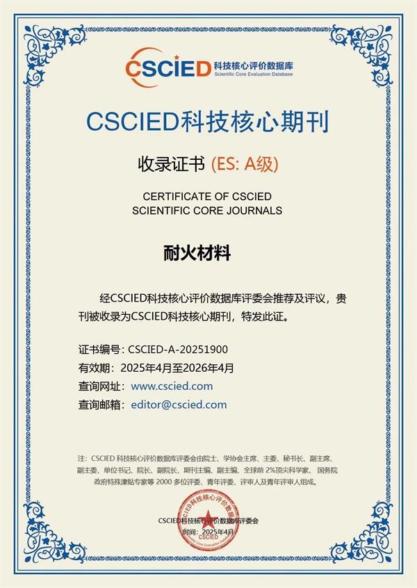 近日,CSCIED 科技核心评价数据库发布年度科技期刊 ES 评分(Evaluation Star)榜单,由中钢洛耐院主管、主办的《耐火材料》凭借卓越的学术质量与突出的行业贡献,以 9.02 的 ES 评分(A 级)成功入选 “CSCIED 科技核心期刊”。这一成果不仅是期刊学术实力的有力证明,更为中钢洛耐的品牌建设注入强大动能,进一步提升了中钢洛耐在耐火材料领域的权威性与国际影响力。