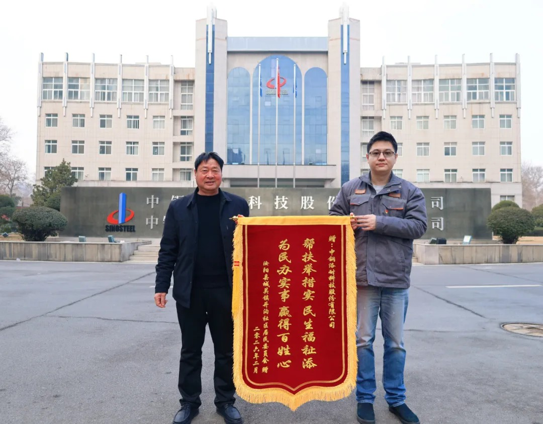 井沟社区党支部书记丁行立专程来到中钢洛耐,送来写有“帮扶举措实民生福祉添,为民办实事赢得百姓心”的致谢锦旗,以真挚情谊感谢公司长期以来的驻村帮扶与大力支持。公司党委副书记、纪委书记侍栎欢代表公司接收锦旗并表示,双方已有多年交往的情谊,这面锦旗既是对中钢洛耐帮扶工作的高度认可,更是一份沉甸甸的信任与期许。